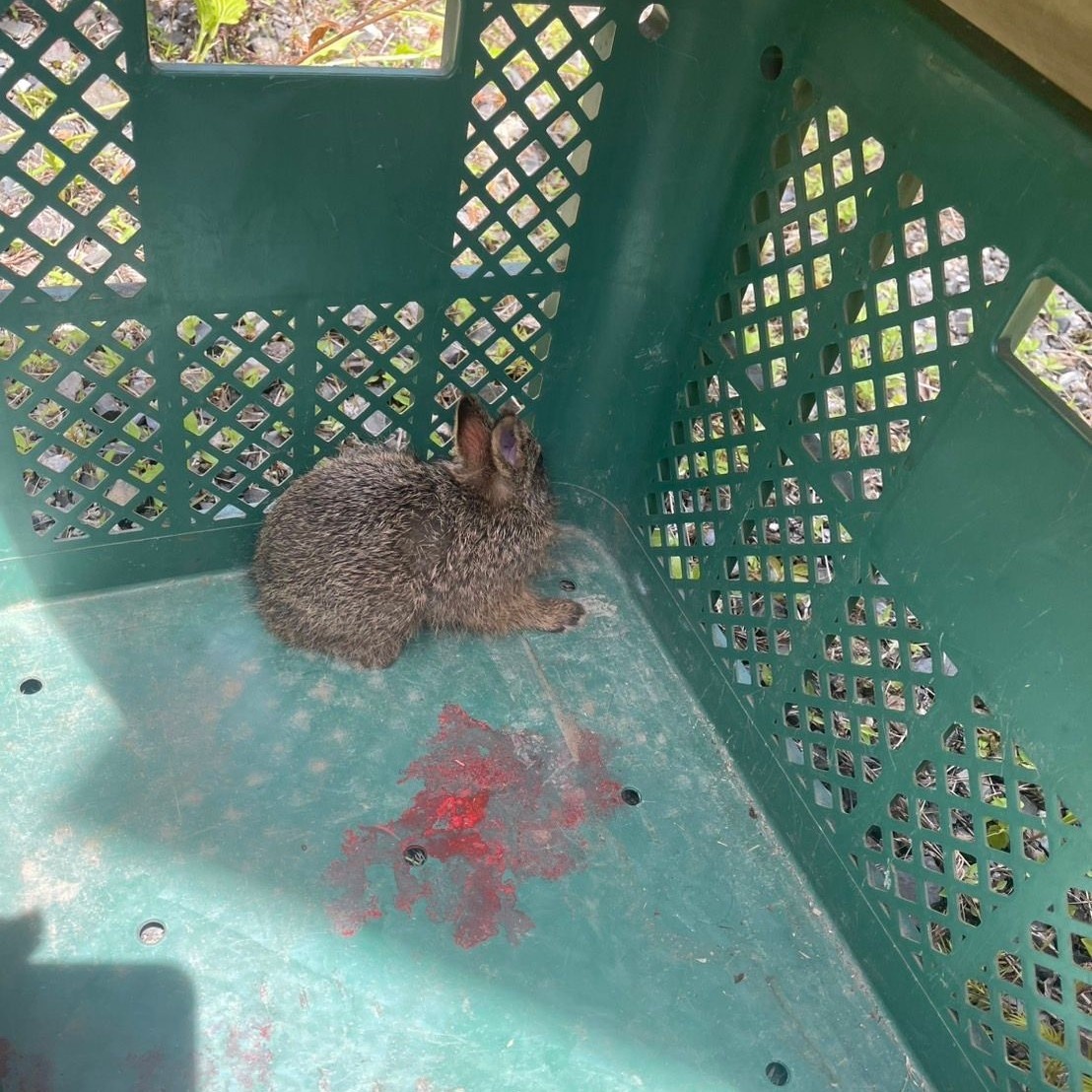 下刈り現場にて、野うさぎを捕まえた敏腕ハンターK君。